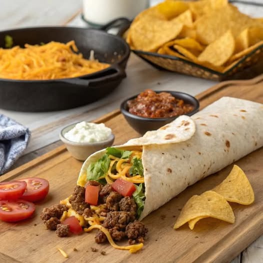Ingredients: 1 lb ground beef 1 packet taco seasoning (or homemade) ½ cup water 4 large flour tortillas 1 cup nacho cheese sauce 1 cup shredded lettuce 1 cup diced tomatoes ½ cup sour cream 1 cup crushed tortilla chips (for crunch ) 1 cup shredded cheddar cheese Instructions: read more on nexte page: